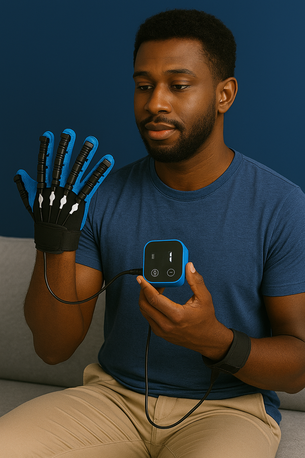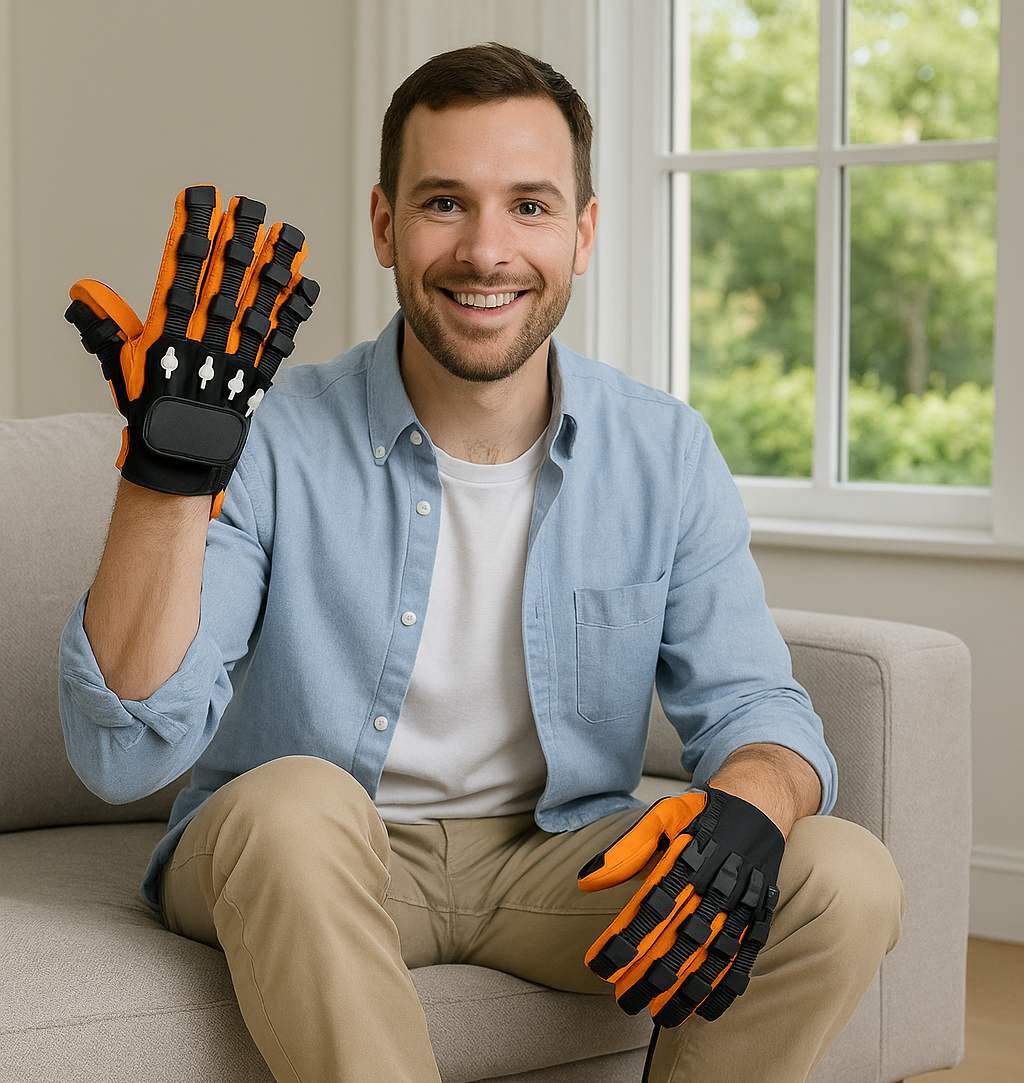 Slide in fingers & fasten the 3 straps for a snug, comfy fit—ready in seconds. Pick your size (M/L), align fingers, secure the 3 straps, connect the 5V/2A host—stable fit means smoother, safer movement.